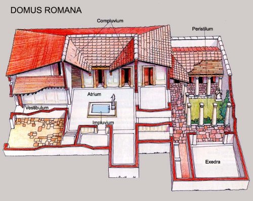 En la domus s'entrava per un corredor, vestibulum, fins a la porta; el passadís continuava fins a l'atri, que era un espai buit amb una obertura en el sostre, compluvium, que es corresponia a terra a una espècie de pila rectangular, impluvium, destinada a recollir l'aigua de la pluja. |