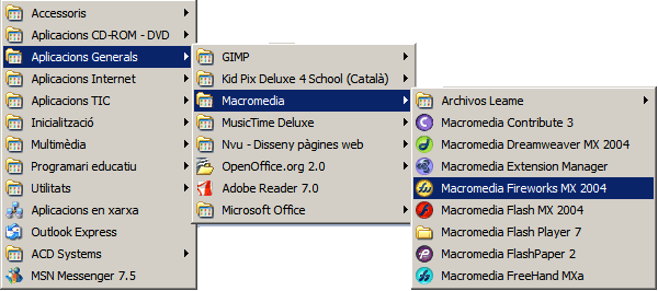 El FIREWORS'MX és una aplicació de la marca MACROMEDIA. Per localitzar el programa al vostre ordinador heu d'anar a INICI/PROGRAMES, posteriorment, segons l'estructura del menú del vostre ordinador, a la carpeta Aplicacions Generals o a la carpeta Apliacions Internet en trobareu una altra anomenada MACROMÈDIA i al seu interior hi ha el Macromedia FIREWORS'MX