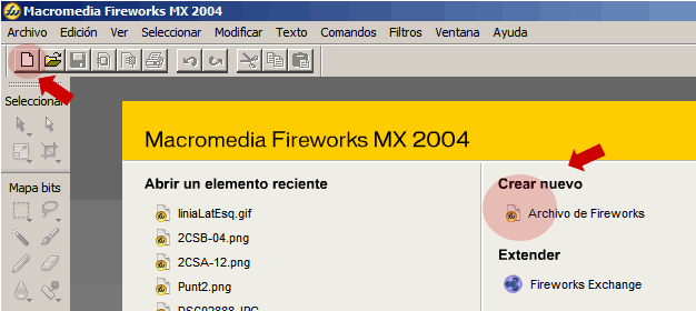 Un cop llançat FIREWORS'MX apareix una pantalla de benvinguda d'on s'ens ofereix obrir documents ja creats o crear-ne un de nou.