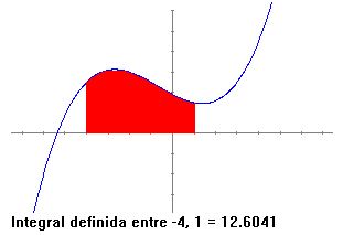 Exemple 2. - Estudi de la integral definida. Representem la següent funció: F(x)=1/20(x3+2x2-11x+38). Per veure que significa el concepte d'integral definida podem començar triant l'opció del menú amb aquest nom i calcular-la, per exemple, entre -4 i 1 i el que observem és el següent: