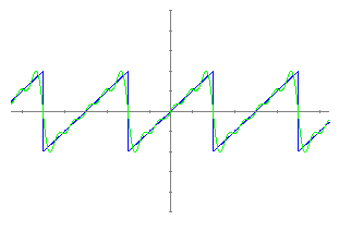 On els coeficients de Fourier són: ![]() On 2l és el valor del període i n = 0,1,2,3,... El que farem a continuació és superposar els successius termes de la sèrie de Fourier damunt la funció dent de serra. Els dos primers termes: F2(x) = 1.273076 sin(px/2) -0.636292 sin(2px/2) ![]() Amb cinc termes: F5(x) = 1.273076 sin(px/2) -0.636292 sin(2px/2) +0.423922 sin(3px/2)-0.317655 sin(4px/2) +0.253829 sin(5px/2)