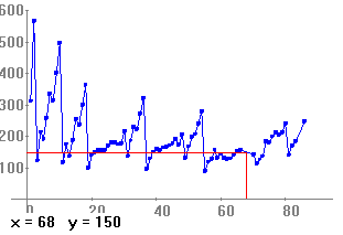 A la vista del dibuix creiem que expliquem el que volem dir. Hem dit al principi que aquest programa també es podia fer servir en camps no necessàriament de les matemàtiques, i, també, veure que el tema funció no és un tema exclusivament matemàtic. Exemple 5 . - Química: càlcul del nombre atòmic desconegut.Mendeliev quan va fer la taula periòdica dels elements tenia el problema de no disposar de tots els elements que es presenten a la natura. Quan va descobrir la taula va intuir les propietats dels elements que els faltava. Suposem que nosaltres ens trobem en una situació semblant i veiem com les matemàtiques (les funcions) ens poden ajudar en aquesta tasca. Plantegem el següent problema: La taula següent ens mostra els valors dels potencials d'ionització dels elements en funció del nombre atòmic. Calcular el potencial d'ionització del Erbi (ER) nº atòmic 68 que no apareix a la taula. nº Ato. Pot. ion. nº Ato. Pot. ion. nº Ato.Pot. ion. nº Ato. Pot. ion. nº Ato. Pot. ion.