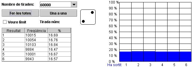 Com a exemple de finestres del programa daus mostrem les taules de freqüències absolutes, relatives (probabilitat) i els diagrames de barres corresponents a: 6, 60, 600, 6.000, 60.000, 600.000, 6.000.000, tirades. Fer això a ma seria una tasca a part de molt i molt tediosa, molt costosa en temps. Esperem que a la vista d'aquests dibuixos s'entengui millor que es vol dir quan diem que la probablitat de sortir un 3, (o un 1, o un 2, o un 4, o un 5, o un 6) val 1/6 (16'67%). ![]() ![]() ![]() ![]() ![]() ![]() ![]() |