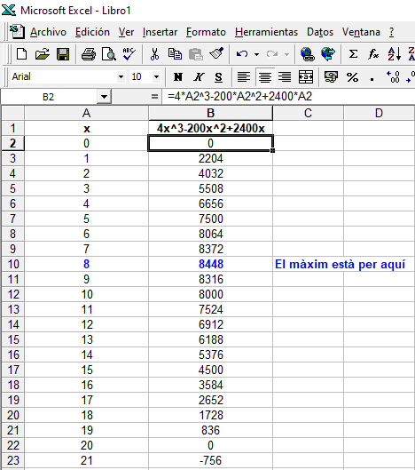 Per trobar un màxim normalment el que es fa és calcular la derivada i igualar-ho a `0`. En teoria no ho sabem fer. Però aquí no va de calcular derivades, sinó de resoldre problemes. Explicaré tres maneres de fer-ho. De fet aquest problema es tret d'un llibre de tercer d'ESO (Matemàtiques 3r ESO, editorial Barcanova, pàgina 104). ![]() 1- Fent servir un full de càlcul fem una taula i mirem quin valor assoleix el màxim. ![]() 2- Fent servir un programa graficador, com Funcions per a Windows i buscant el màxim. ![]() 3- Un dia us vaig explicar el que eren les derivades, i si mal no recordo, vaig explicar que per calcular la funció derivada d'un monomi, `f(x)=ax^2 => f'(x)=a·nx^(n-1)`. Així la derivada del nostre polinomi, `f(x)=4x^3-200x^2+2400x` serà: `f'(x)=12x^2-400x+2400`. Si no ho recordeu, cap problema, quedeu-vos amb el resultat. També recordo que la derivada tenia que veure amb el pendent de la recta tangent. Per la qual cosa en un màxim hem de trobar on la derivada val `0`. ![]() En definitiva hem d'igualar al funció derivada a `0` i un dels dos resultats serà la `x` del màxim. `12x^2-400x+2400=0` les solucions aproximades són `x_1=7'85` i `x_2=25'49`. Evidentment el segon resultat no té cap sentit ja que com a màxim el tall vertical pot fer `20cm`, ja que la cartolina mesura `40cm`. O sigui si fem un tall de `7'85cm`, obtindrem una capsa sense tapa a partir de la cartolina de `60·40` de volum màxim, `f(x)=4·7'85^3-200·7'85^2+2400·7'85=8450'45 cm^3`. Aquesta última manera, pels que no hi vau ser al principi del tema, no us sonarà de res. He volgut posar aquests exercicis perquè ens en donessim compta de la gran ajuda que ens poden aportar les funcions en la resolució de problemes. Evidentment la tercera manera no és de tercer d'ESO. Oficialment ja correspondria a 2n de BAT. |