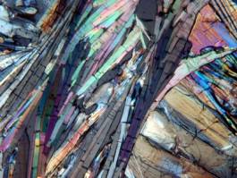 Vista de la preparació d'àcid benzoic amb els filtres polaritzadors creuats (després de girar el polaritzador uns 90º respecte de la posició anterior i 360º respecte de la posició inicial).