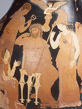 El consell dels déus. Detall d'un pèlice de figures vermelles (350aC). Museu de l'Hermitage. Sant Petesburg. Asseguda, a l'esquerra, Temis aconsella Zeus, al centre.