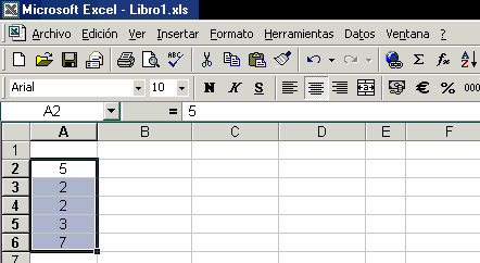 Primer veurem com s'ordenen dades. Si les dades són 5, 2, 2, 3 i 7 (les de l'exemple anterior), s'introdueixen les caselles d'una columna buida i se seleccionen aquestes dades amb el punter del ratolí.