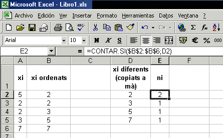 posat =CONTAR.SI($B$2:$B$6;D2). Això vol dir que el programa
