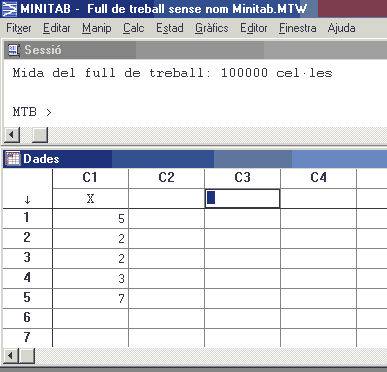 Primer veurem com s'ordenen dades. Si les dades corresponen a una variable estadística quantitativa discreta i són 5, 2, 2, 3 i 7 per exemple, s'introdueixen en una columna buida, per exemple la C1. Per cert, a la columna C1 li hem posat com a nom X (pas opcional).