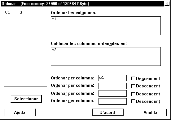 Es prem el menú Manip | Ordenar... i a la finestra que apareix s'escriu directament c1 en el camp Ordenar les columnes: (o bé es fa doble clic a sobre de C1); c2 (que és una columna buida) en el camp Col·locar les columnes ordenades en:; i c1 en el camp Ordenar per columna, de manera que la finestra quedi com es veu a continuació):