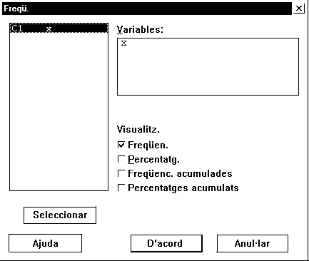 Com veiem, apareixen dues columnes, una anomenada x, que conté els valors xi de la variable, i una altra, anomenada Cte. ("compte"), que conté els valors de les freqüències absolutes ni corresponents.