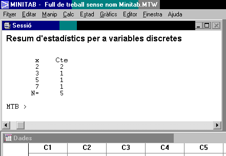Després es prem D'acord i es mira la finestra Sessió del Minitab. S'observarà el recompte desitjat: