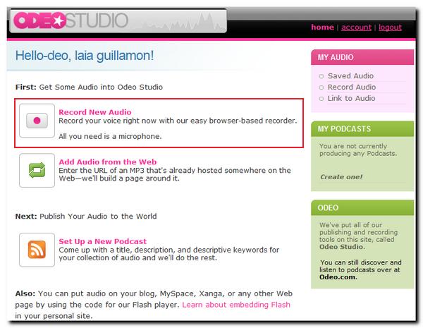 Aquest és el panell d'enregistrament d'Odeo Studio. Per començar a enregistrar cal que comproveu que el micròfon del vostre Pc està habilitat i funciona correctament. Tot seguit feu clic sobre el botó Record i enregistreu el text desitjat. Un cop finalitzat haureu de fer clic sobre Stop i seleccionar Play per escoltar el que heu enregistrat. Si l'enregistrament ha resultat correcte feu clic sobre Save Recording. Si no us agrada o és incorrecte feu clic sobre Clear Audio i repetiu l'operació.