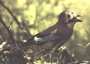 Medeix uns 33cm. El cos és d'un to marró rosat, una franja alar blanca i unes barres de color blau, blanc i negre a les cobertures alars. Destaca en vol el seu carpó, d'un blanc lluent, que contrasta amb la cua que és negra. El seu crit és estrident i aspre. Pot imitar sons d'altres ocells. |