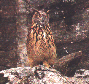 És el més gran dels nostres rapinyaires nocturns, pot arribar als 70 cm. de llargada. El dens plomatge, molt estarrufat, és combinat de tons terrosos, tacats o finament barrats d'un fort marró. Al front té dues grans "orelles" de plomes. Té els ulls, grossos i ataronjats, de mirada penetrant i fera. |