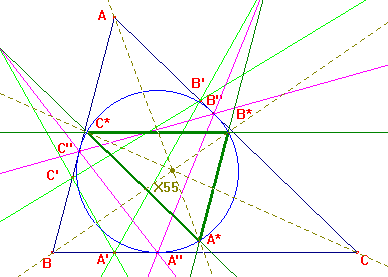 Sigui A'B'C' el triangle òrtic, A"B"C" el triangle de contacte interior. Les rectes simètriques de A'B' en A"B", B'C' en B"C", C'A' en C"A" formen un triangle A*B*C* que té els vèrtexs a la circumferència inscrita i que és homotètic amb ABC amb centre d'homotècia X(55).