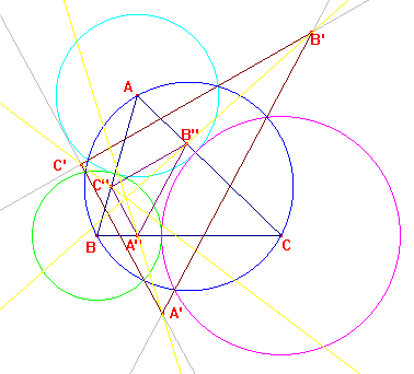 Los ejes radicales entre la circunferencia circunscrita y las circunferencias con centros A, B y C que pasan por los vértices del triángulo de contacto interior limitan un triángulo homotético al triángulo órtico.