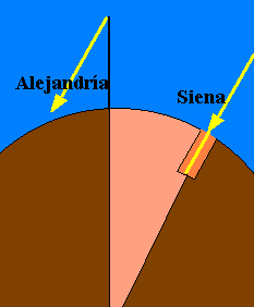 La idea genial d’Eratòstenes va consistir en adonar-se’n que l’angle d’inclinació del raigs del Sol respecte a la vertical en Alexandria coincidia amb l’angle, en el centre de la Terra, que separava les dues ciutats, Alexandria i Siena. Així, aplicant la propietat que una recta tallada per dos paral·leles determina angles iguals, va aconseguir conèixer la mida d’un angle en el centre de la Terra simplement mesurant un angle en la superfície, precisament en el lloc on ell es trobava.