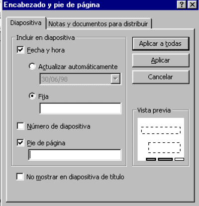 Podem seleccionar la mida, numerar i establir l’orientació de les diapositives. També ens permet escollir la modalitat de presentació de les notes, els documents i els esquemes. Configurar capçalera i peu de pàgina Des de l'opció Encabezados
