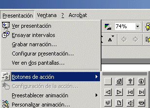 A qualsevol diapositiva s'hi pot incorporar un botó d'acció. Aquests botons ens permetran fer unes accions senzilles per desplaçar-nos per la presentació o per reproduir so, imatges... Un botó d'acció