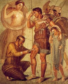 del seu fill Iulus, mentre un metge el cura amb l'ajuda de Venus.