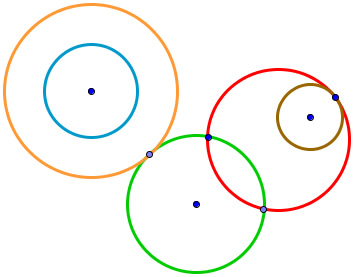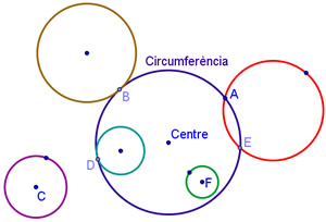 | A continuació pots utilitzar la imatge següent per analitzar les posicions relatives de les circumferències entre elles. Per fer-ho pots fer-te preguntes com les que segueixen: |