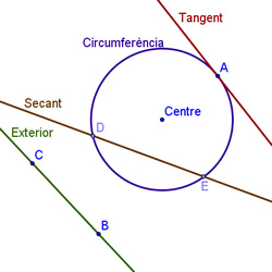 Utilitzant les explicacions que hi ha en aquesta pàgina i les eines de la finestra geogebra construeix, respecte la circumferència dibuixada, una recta tangent, una recta exterior i una recta secant. |
