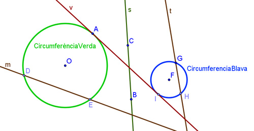 | A continuació pots utilitzar la imatge següent per analitzar les posicions relatives de les rectes respecte les dues circumferències. Per fer-ho pots fer-te preguntes com les que segueixen: |