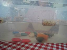 Recipient amb aigua. Objectes diferents: pedres, taps de suro i botons