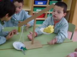 Materials: balances, suro, plastilina i diferents objectes. Donem a cada nen un suro i un tros de plastilina i cada nen individualment la pesa i completa la fitxa. Un cop fet això passem a pesar diferents objectes per tal que vegin la relació que hi ha entre el pes i la mida i que també puguin ser capaços de veure que no hi ha relació entre mida i pes, sinó que depèn del material en que està fabricat l'objecte. |
