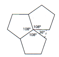 108º. Amb 3 pentàgons només aconseguim 324º, i