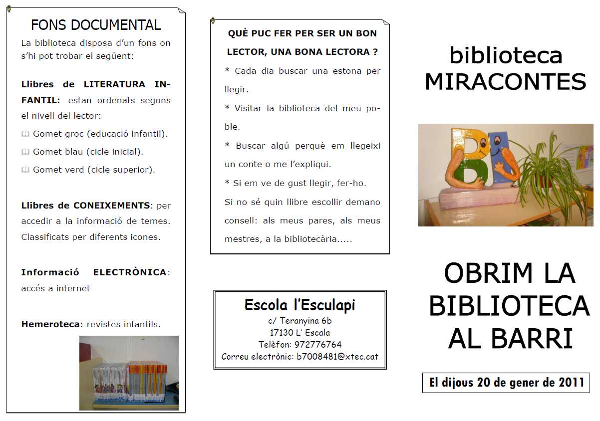 El dijous 20 de gener obrim per primer cop la nostra biblioteca al barri, que passarà a funcionar com a biblioteca pública els dimarts, dijous i divendres de les 17h a les 18:30h durant el periode escolar. Dotada amb un fons de literatura infantil per a nens de primària, disposa també de tres ordinadors amb accés a Internet.