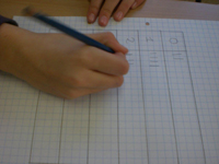 The teacher explains that the class will do an activity with two dice. the pupils have to throw the dice, 20 times each group and calculate the diferrences between the results. they take notes of the results in pairs and then put all the data into the table drawn on the blackboard. Before throwing the dice, each pupils writes down what result they think will occur.