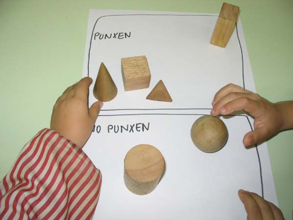 - Adonar-nos de les formes que tenen els cossos geomètrics pel tacte o la vista, per l'ombra que fan, pels elements que els constitueixen.