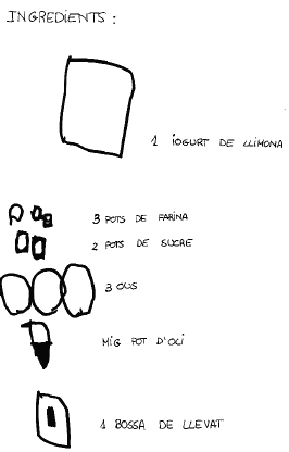 Per fer la coca posem el iogurt de llimona al bol, després tres pots de iogurt plens de farina i dos pots de iogurt plens de sucre i ho remenem. deprés vam trencar els tres ous, els vAm batre i els vAm tirar al bol. desprÉs el mig got doli i el sobre de llevat i ho vam remenar ben remenat. després ho vam ficar al forn i quan estava cuita, vam tirar xocolata i pinyons.
