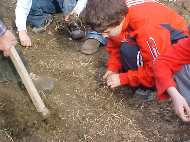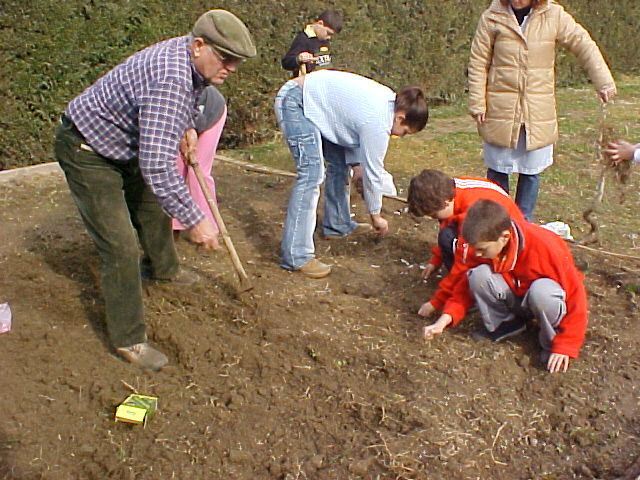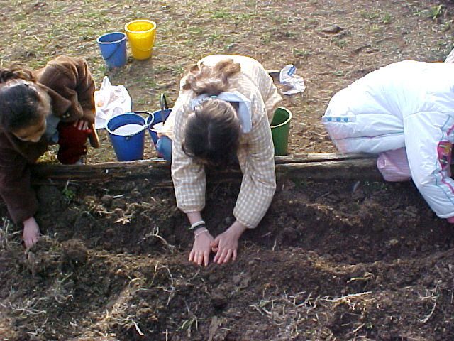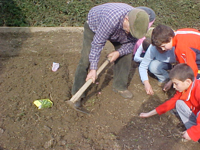 Quan arriba el temps, ens preparem per abonar i fangar l'hort, i per sembrar-hi llavors i bulbs de diferents verdures.