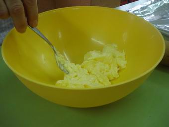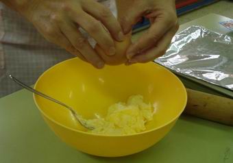 PREPARACIÓ: 1. Posem la mantega en el bol i remenem una mica amb la forquilla per estovar-la. 2. Afegim els ous. |