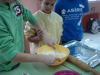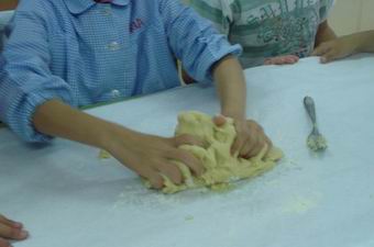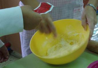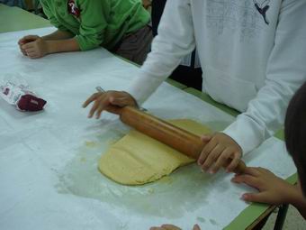 Remanem bé. Primer amb la forquilla. 6. Quan no es pugui més amb la forquilla, ho fem amb les mans. 7. Extendre la pasta amb el corró, moltes vegades, perquè quedi ben amassada. |