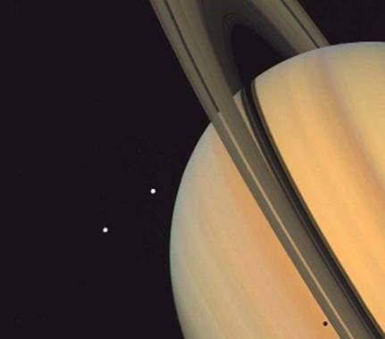 Saturn i tres dels seus satèl·lits fotografiats per una sonda espacial.