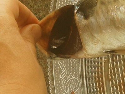 brànquies que estaven a sota de la fenadura branquial Vam aixecar la tapa de l'opercle i vam comprovar que la boca estava connectada amb les brànquies per tal de poder fer-hi circular l'aigua i agafar-ne l'oxígen. Interessantíssim!!! |