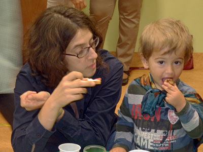La Maria Castanyera, ben acompanyada per les notes de l'acordió de l'Aritz, està ben atenta quan li mostrem com ballem la seva dansa |
