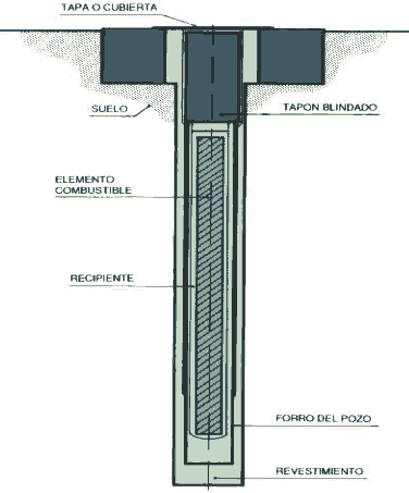 -Emmagatzematge en pous: Sistema passiu que consisteix en cavitats excavades en la terra, amb la profunditat i diàmetre necessari per a albergar diversos elements combustibles. Els pous estan recoberts per una làmina d'acer i dotats d'una tapa blindada. Els pous solen estar sobre la superfície o poden estar al sòl d'un túnel subterrani. |