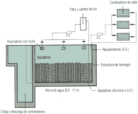 Les piscines estan construïdes de formigó armat, les seves parets estan recobertes internament de làmines d'acer inoxidable soldades per a evitar fugues i estan dissenyades com a estructures capaces de suportar successos extens extrems (terratrèmols). Les seves dimensions són variables, encara que la profunditat ha de ser suficient per a que els elements combustibles, d'un màxim de 4,5 metres de longitud, situats i manejats verticalment, estiguin sempre coberts per 3 metres d'aigua.