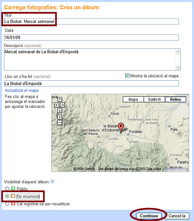 - Com a títol d'àlbum entreu Nom població. Nom mercat-fira (per exemple: La Bisbal. Mercat setmanal). Opcionalment podeu canviar la data i podeu entrar una descripció i el lloc on s'ha fet.