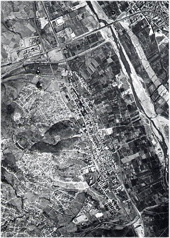1. Observa aquesta fotografia aèria de Sant Vicenç dels Horts de l'any 1967. Digues quines dues vies de comunicació importants hi observes.