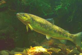 Brown Trout are fish, which are silver and brown with red spots on their sides. They live in clean, fast-flowing rivers and over many years can grow up to 70 cms long. They have lots of small teeth to catch hold of minibeasts but they swallow their food whole. They do not chew it. They like eating mayflies when the nymphs are 'hatching' into adults on the surface of the water. Although most trout die within weeks of hatching, a few live for up to ten years. A female trout lays about 1,500 eggs in a hole she digs in clean gravel on the bottom of the stream where there is lots of oxygen in the water. |