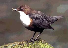 The Dipper is a chocolate brown bird with a bright white bib. It grows to 18 cms in length. We are very lucky to see lots in Snowdonia.Dippers are found in rocky, fast-flowing streams. They stand on large rocks or boulders in the fast-flowing stream to look out for food. Then they swim or walk under the water to catch minibeasts and small fish.They build their nests out of moss under waterfalls, banks or bridges. The eggs hatch after about 15 days and the young birds fly at three weeks but they can swim earlier. |