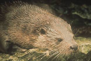 The otter is a large, slim, flat-headed animal, which grows up to 1.3 metres long. It swims and dives well, with its strong, short legs and webbed feet. It can stay under water for a minute or so. It eats fish, eels and frogs and needs clean water to live in. The otter is a mammal. To keep warm under water it has two layers of fur. The outside layer is long and keeps the water out. The inside layer of fine fur traps air for insulation. Otters groom their fur to keep it waterproof. Otters rest in the day in thick bushes. They raise two or three cubs in a holt, which is usually a hollow in a river bank under tree roots. They do not like to be disturbed by people. You will be very lucky if you see one in the wild, but there are several in Snowdonia. |