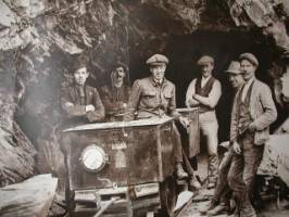 Here is a picture taken at the beginning of last century. It shows the men ready to go down into the mine with a cart. Notice how they are dressed in smart clothes, none of them are wearing safety gear. |