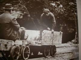 Here is another picture of the cart moving. They went quite fast along the tracks. They would be used to carry the miners down the mine and carry the slate back up to the surface. These pictures were in the museum at Llechwedd Slate Caverns. |